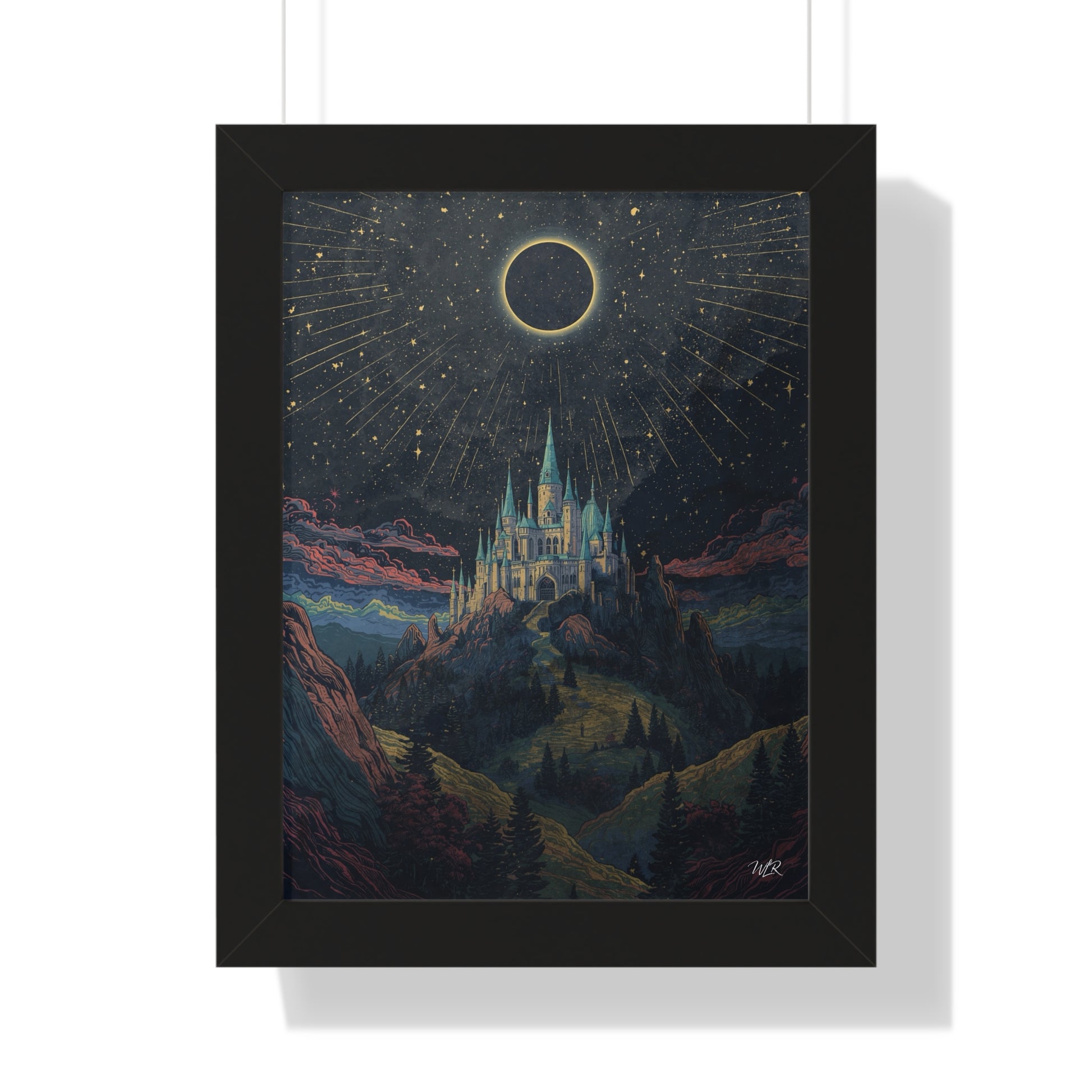 Elevate your space with this framed vertical poster featuring celestial kingdom under eclipse with falling stars, creating an epic fantasy atmosphere. Perfect for fantasy enthusiasts and those who love celestial imagery. Ideal for decorating bedrooms, offices, or living spaces.