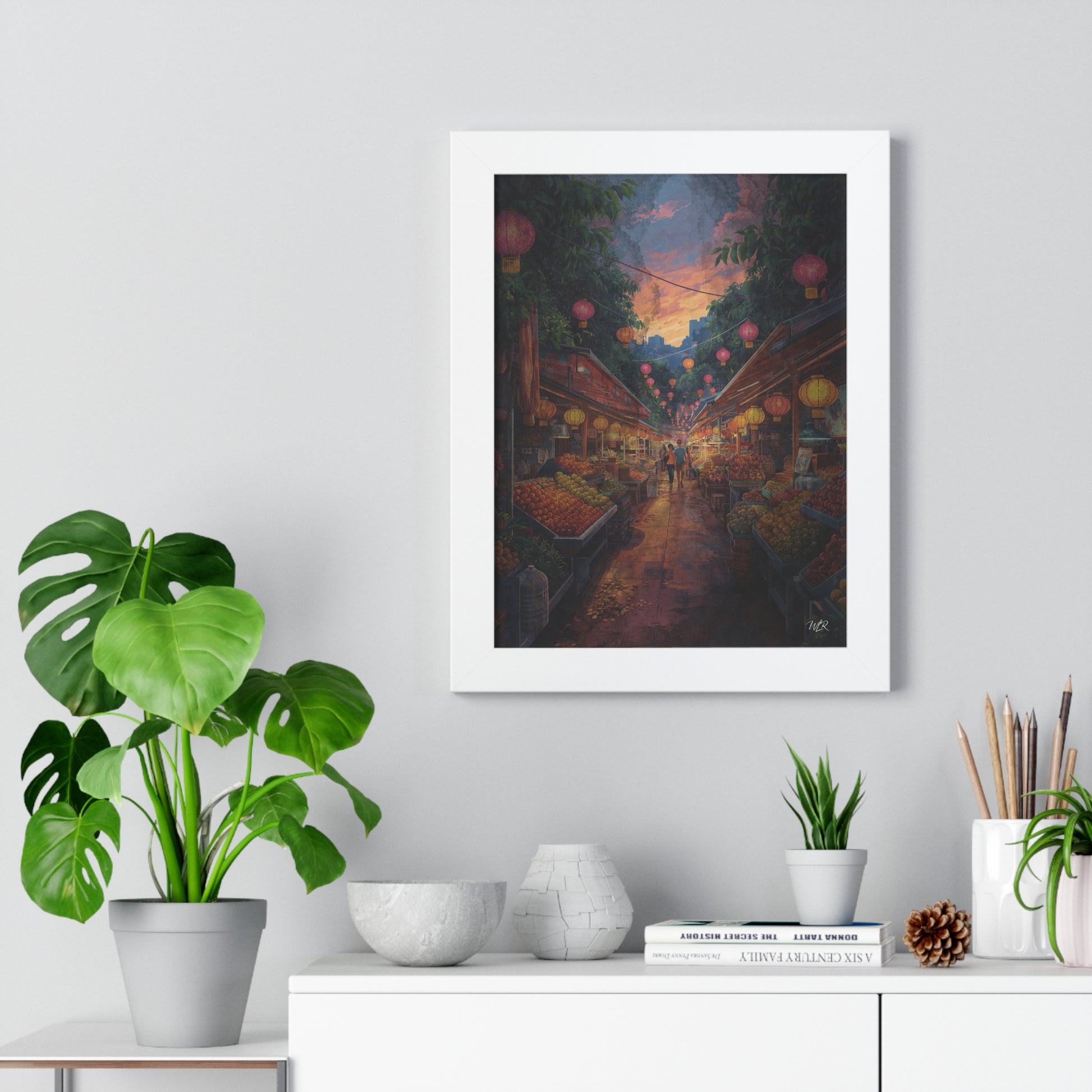 Bring the vibrant energy of a lantern-lit street market with glowing fruit stalls into your home with this colorful and textured poster. Perfect for those looking to add a pop of color and excitement to their living space. Ideal for individuals who love eclectic and lively decor.