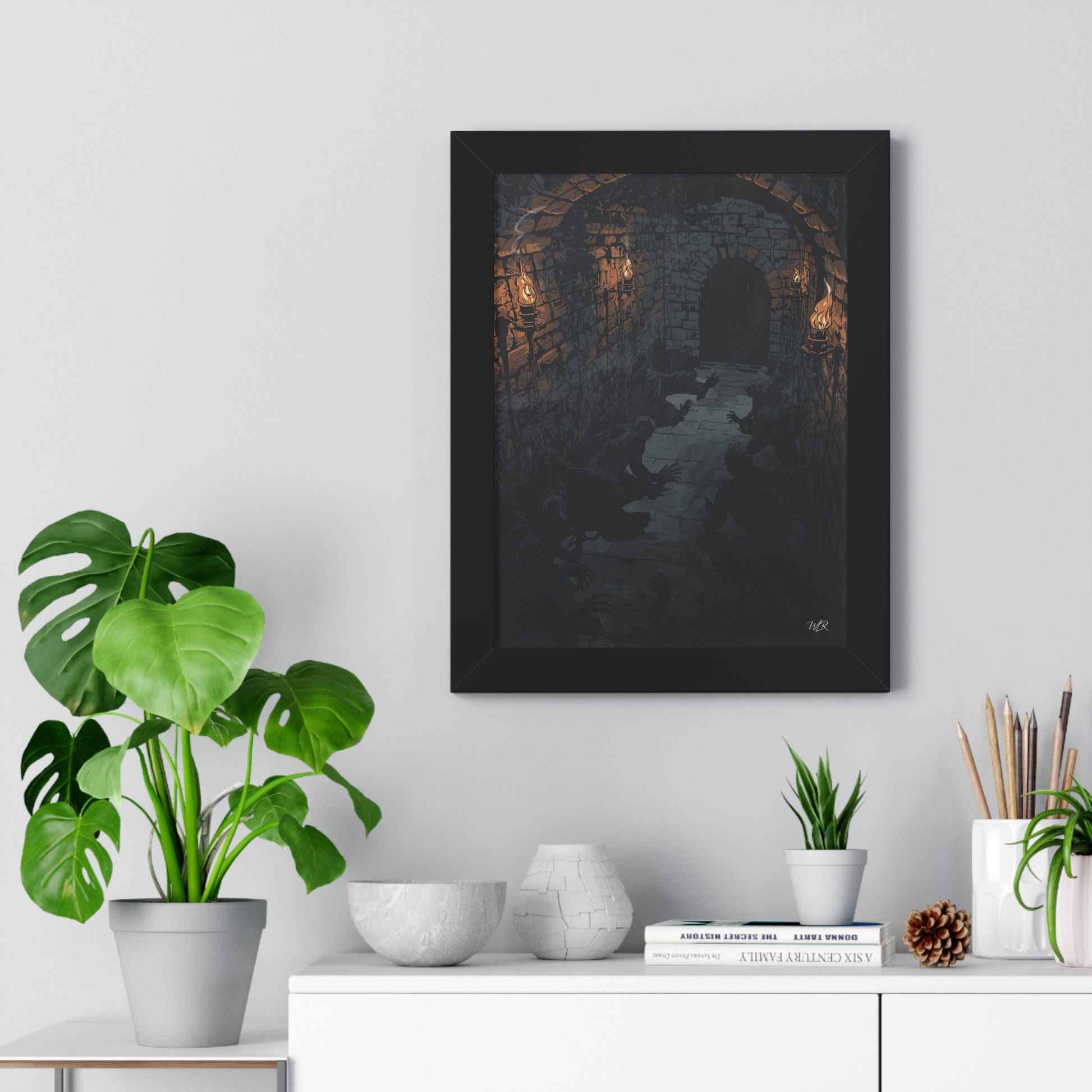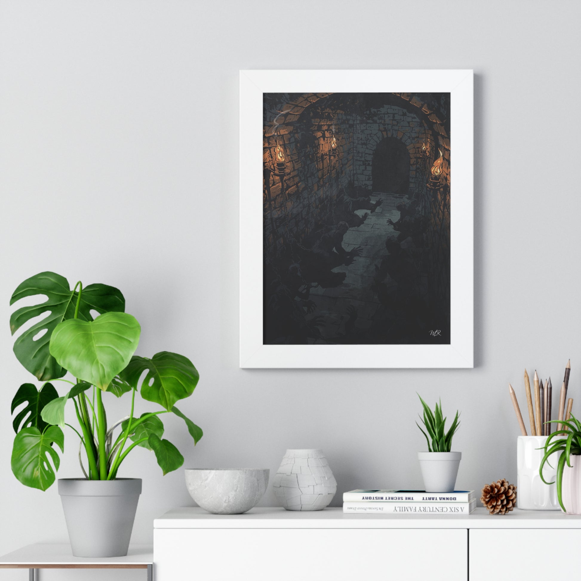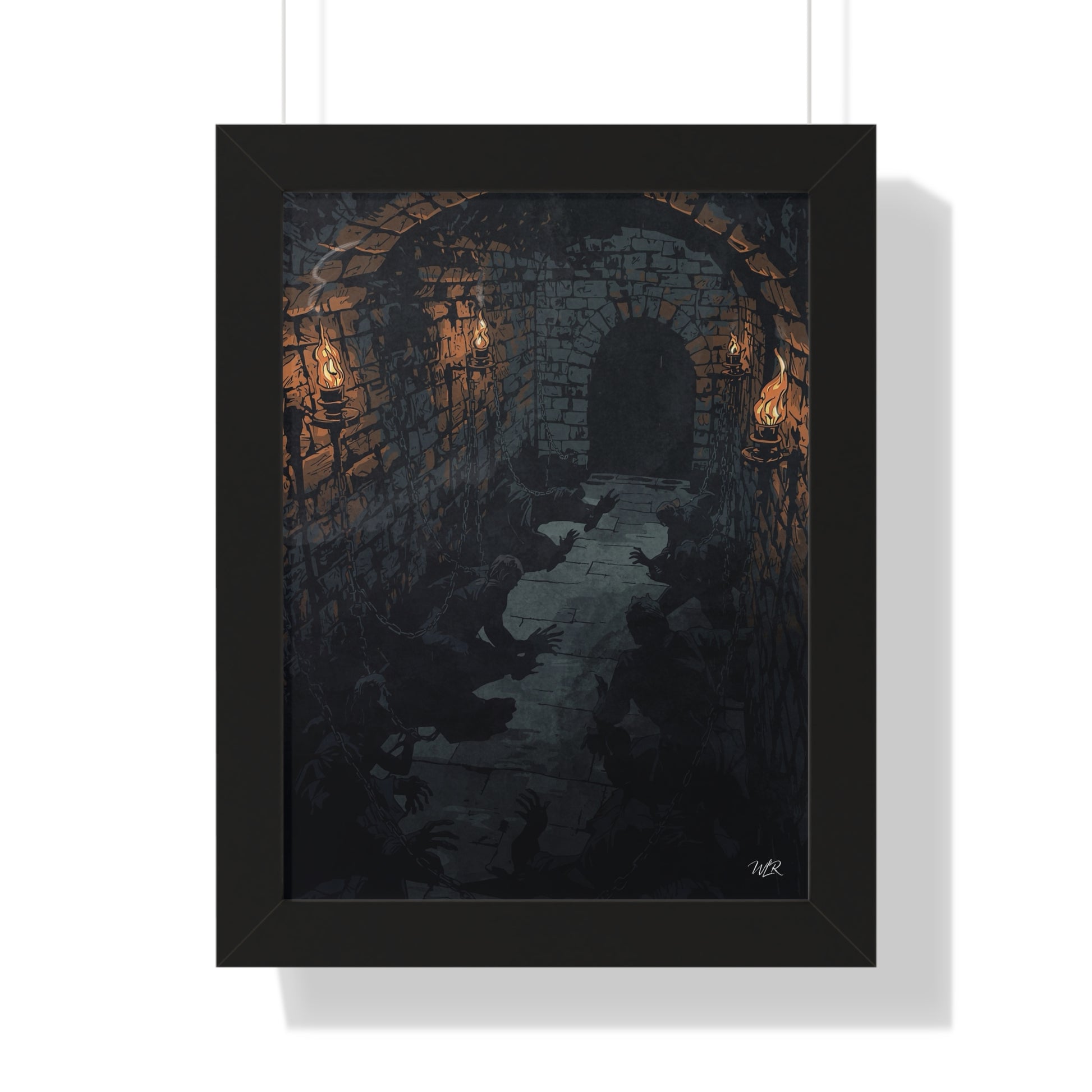 Dark and haunting poster featuring artwork of a medieval dungeon lit by torches, with shadows of chained prisoners stretching across stone walls. Perfect for lovers of gothic decor or fans of medieval history. Great for Halloween decor or as a unique gift for horror enthusiasts.