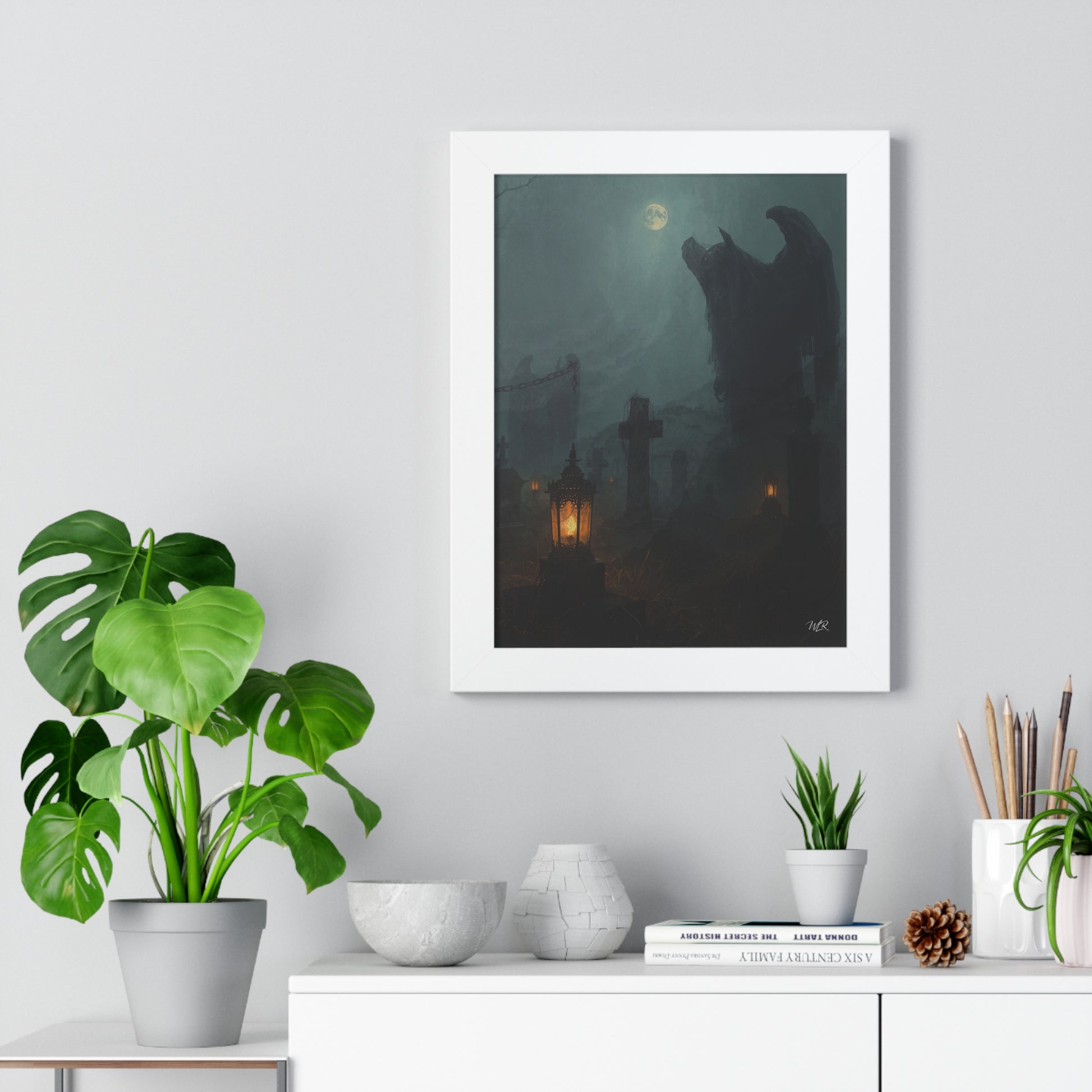 Evoke a hauntingly beautiful and eerie atmosphere with this framed vertical poster featuring a foggy graveyard, glowing lanterns, and shadowy statues.