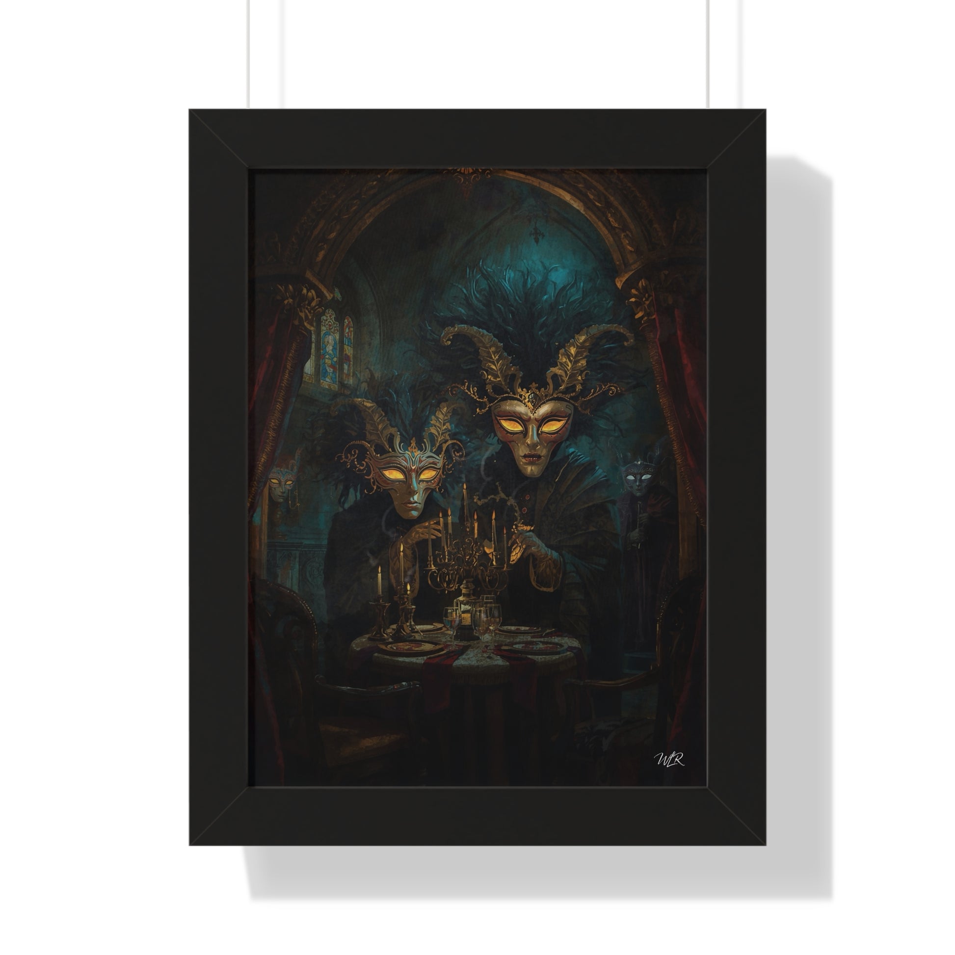 Evoke a mysterious and eerie atmosphere with this framed vertical poster featuring a masquerade ball scene with sinister glowing masks in a gothic interior.