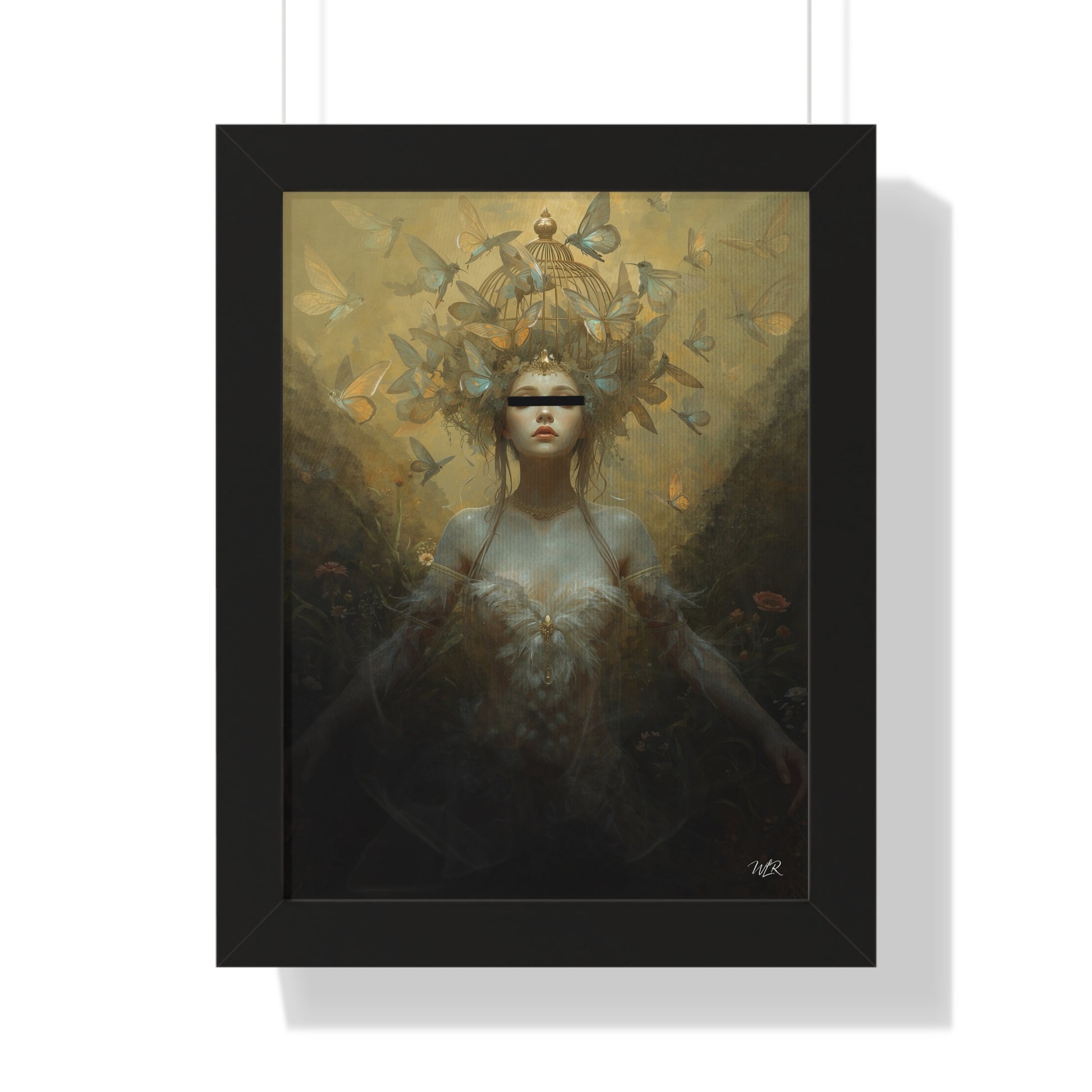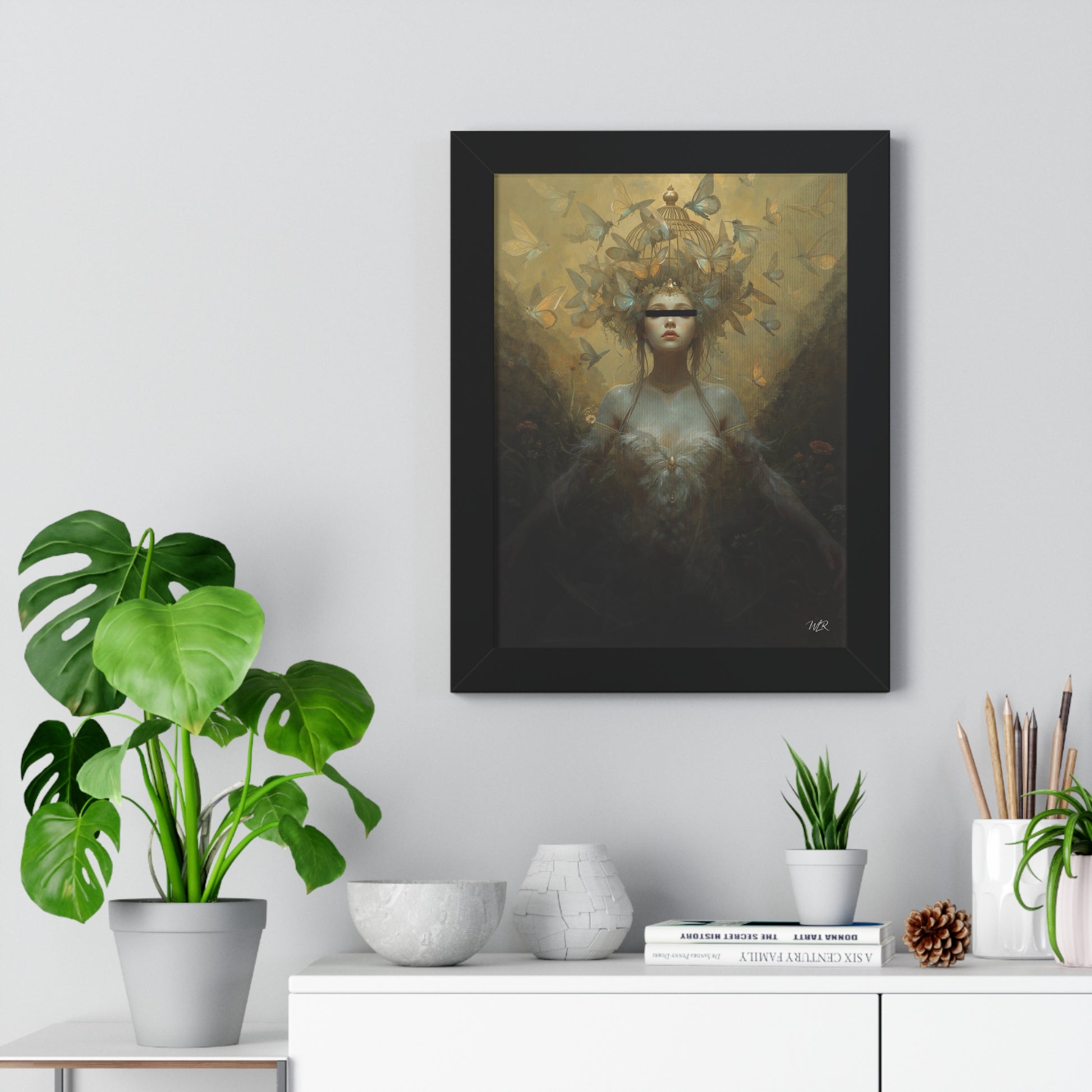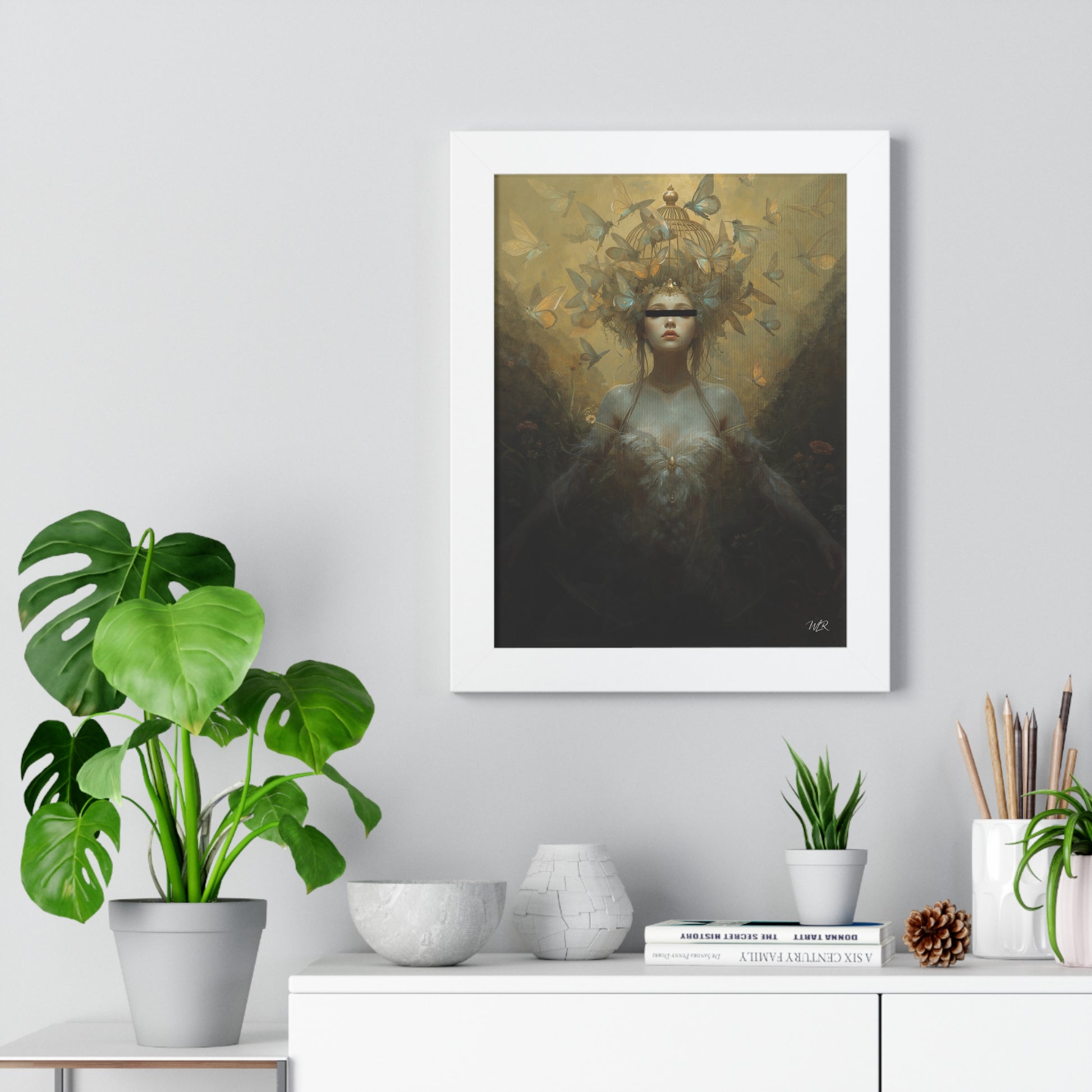 Surreal poster artwork featuring a human figure with a birdcage head releasing glowing moths, with painterly textures adding depth. Perfect for those who appreciate unique and symbolic art, this poster fits well in modern and eclectic home decor. Ideal for art enthusiasts, those who enjoy surrealism, and individuals looking to add a touch of intrigue to their living space. Relevant for gifting during birthdays, housewarmings, and art-themed occasions.