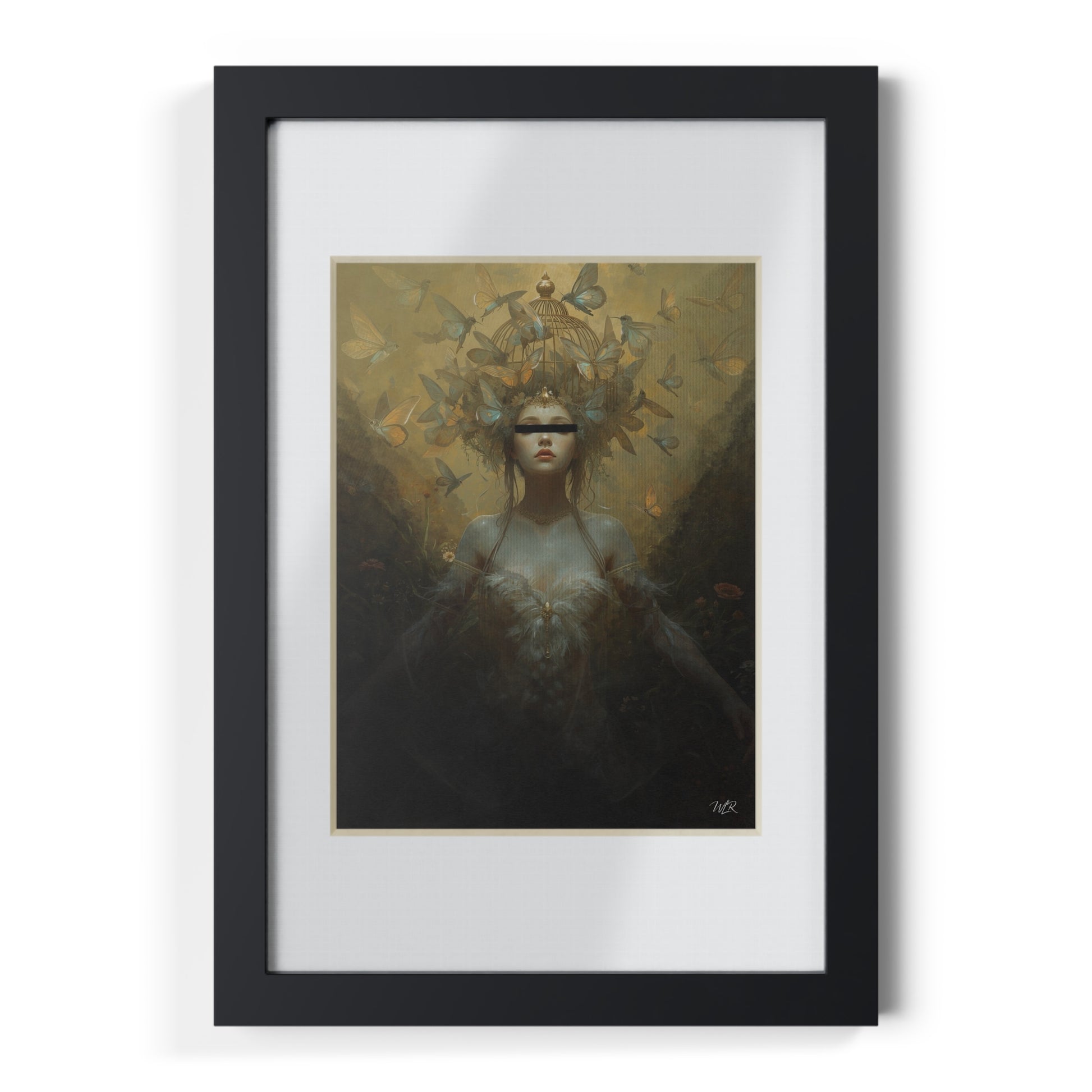 Surreal poster artwork featuring a human figure with a birdcage head releasing glowing moths, with painterly textures adding depth. Perfect for those who appreciate unique and symbolic art, this poster fits well in modern and eclectic home decor. Ideal for art enthusiasts, those who enjoy surrealism, and individuals looking to add a touch of intrigue to their living space. Relevant for gifting during birthdays, housewarmings, and art-themed occasions.