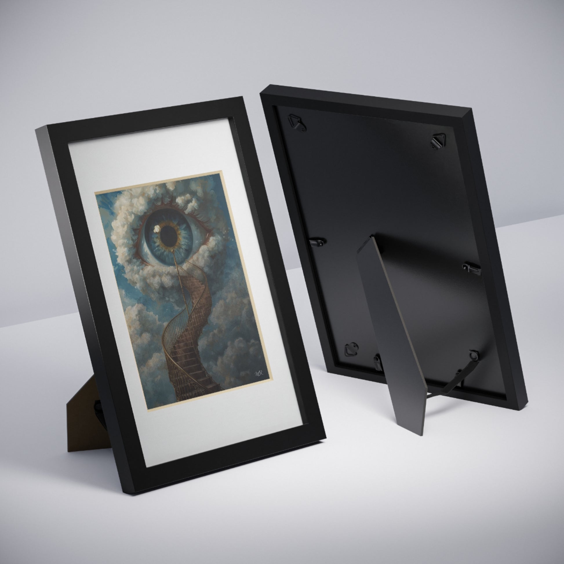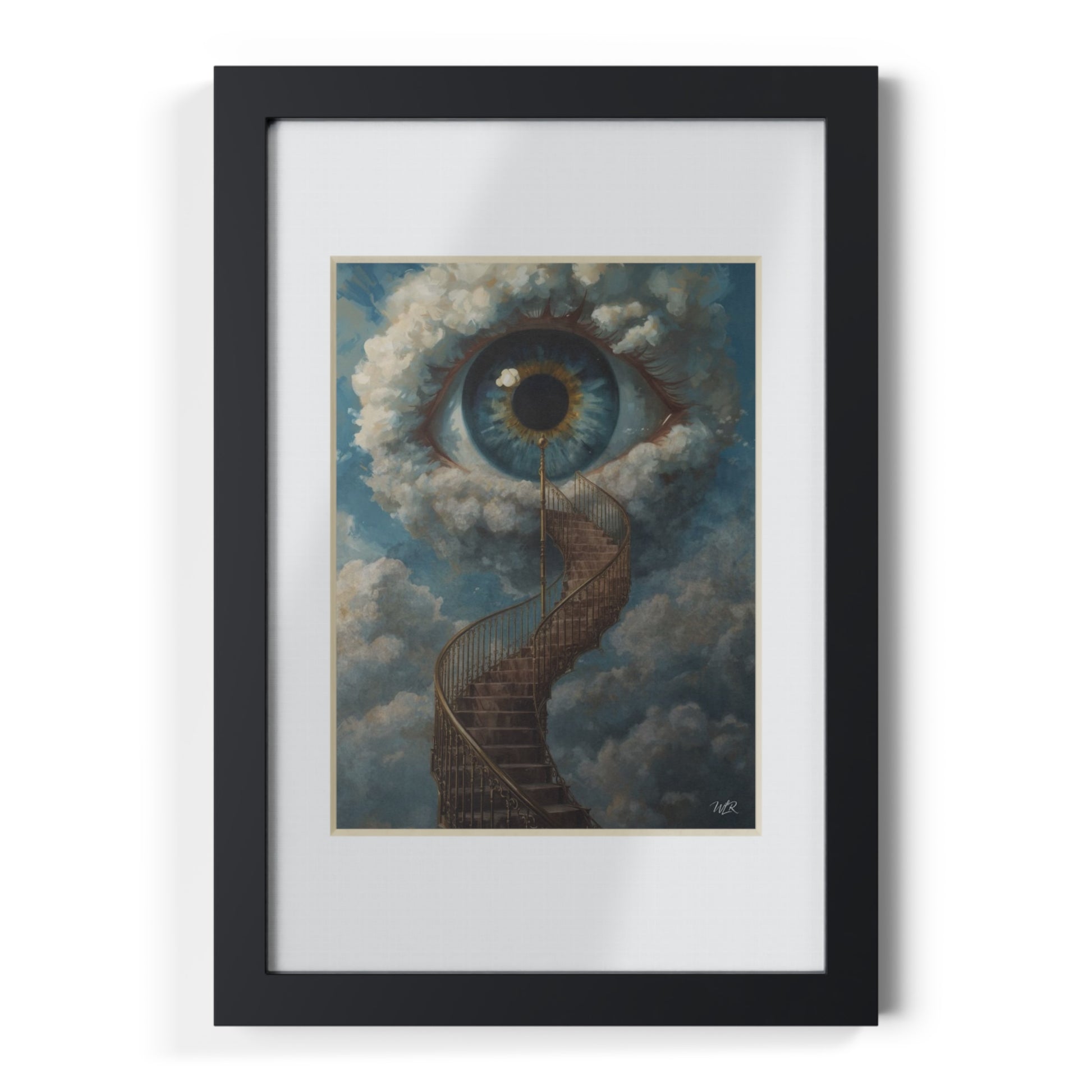 Surreal and dreamlike vertical poster featuring a staircase spiraling into a giant human eye in the clouds. Perfect for art lovers and those who appreciate painterly surrealism. Ideal for home decor, adding a touch of whimsy and intrigue. Relevant for art enthusiasts, dreamers, and those seeking unique and intriguing wall art.
